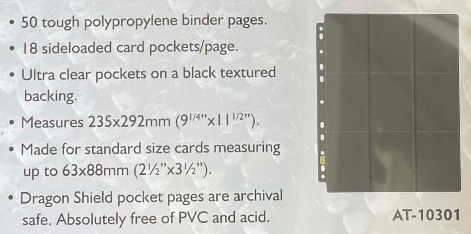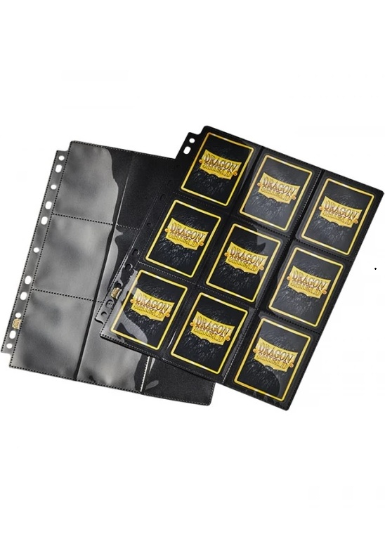 Dragon Shield fekete, oldalról tölthető mappalapok, melyek univerzális 11 lyukasztással rendelkeznek. 1-1 mappalap 18 zsebbel rendelkezik, ez oldalanként 9-9 különálló zsebet jelent.