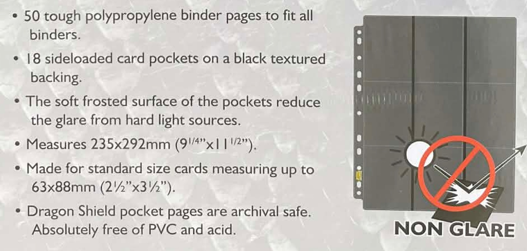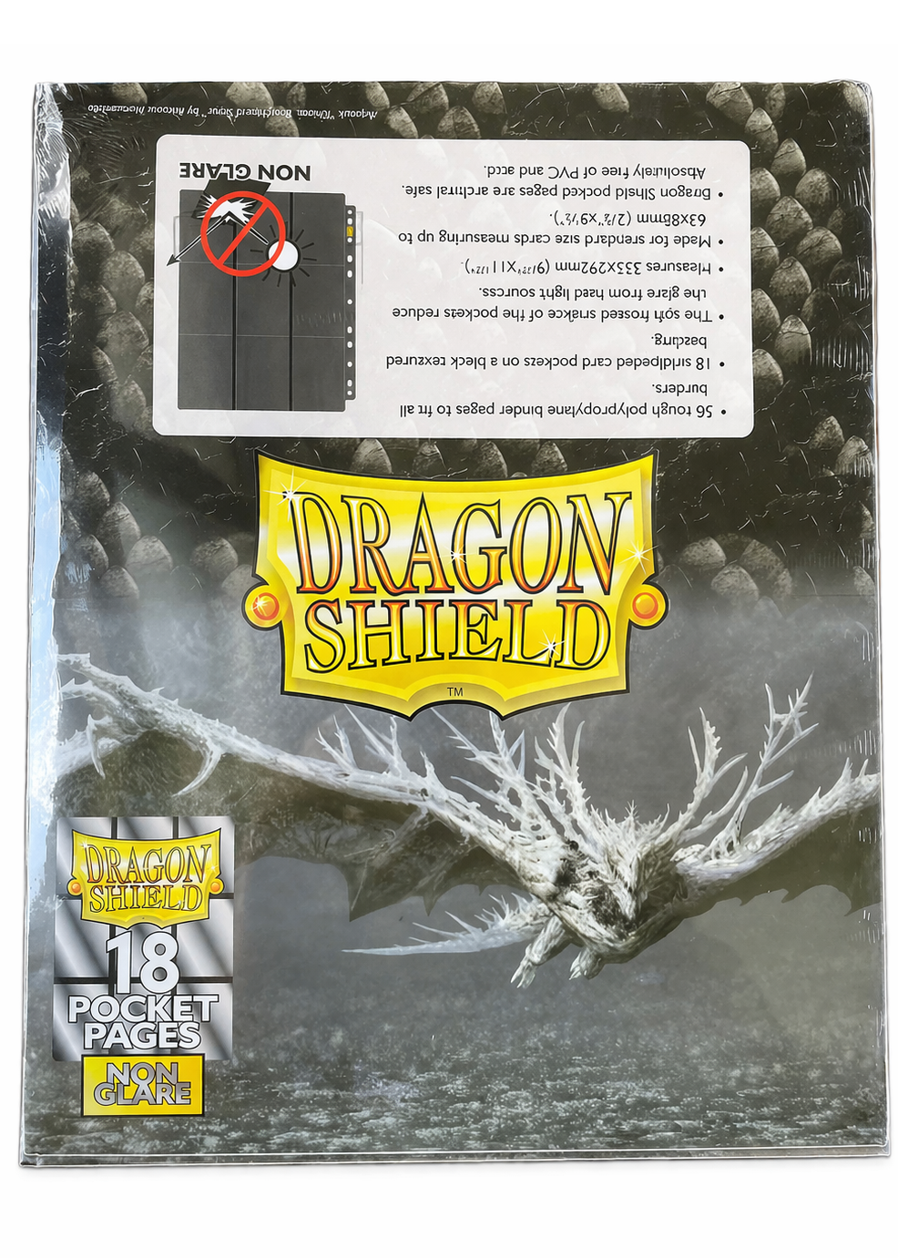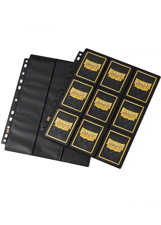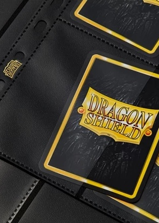 Dragon Shield fekete, oldalról tölthető mappalap, mely univerzális 11 lyukasztással rendelkezik. 1-1 mappalap 18 zsebbel rendelkezik, ez oldalanként 9-9 különálló zsebet jelent.